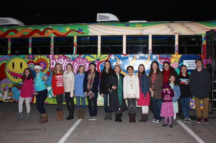 What a FUN way to buzz (BUS!) around town looking at Christmas lights, hanging with and making new friends!! We had a GREAT time, despite Ruby looking shy in the photo below.. her first time ever on a bus…. for most of my gals!
