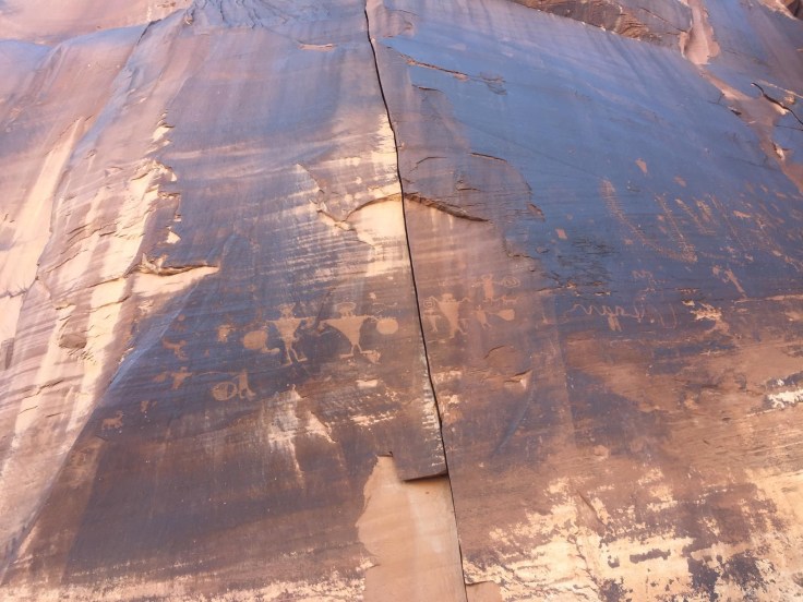 Afterwards, we stopped and checked out Indian petroglyphs and pictographs on the rock wall along road + Colorado River. It’s amazing to try and decipher the story they’re trying to tell. All told, we had a wonderful day in Moab with friends.