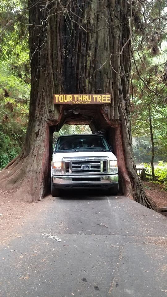 In our case, our trusty WHITE van squeaked (still crunched a mirror!) through a Redwood trunk… I don’t know why I was shocked that the wood was actually red!! I got a very close look as we had about an inch or less on each side as we drove through!