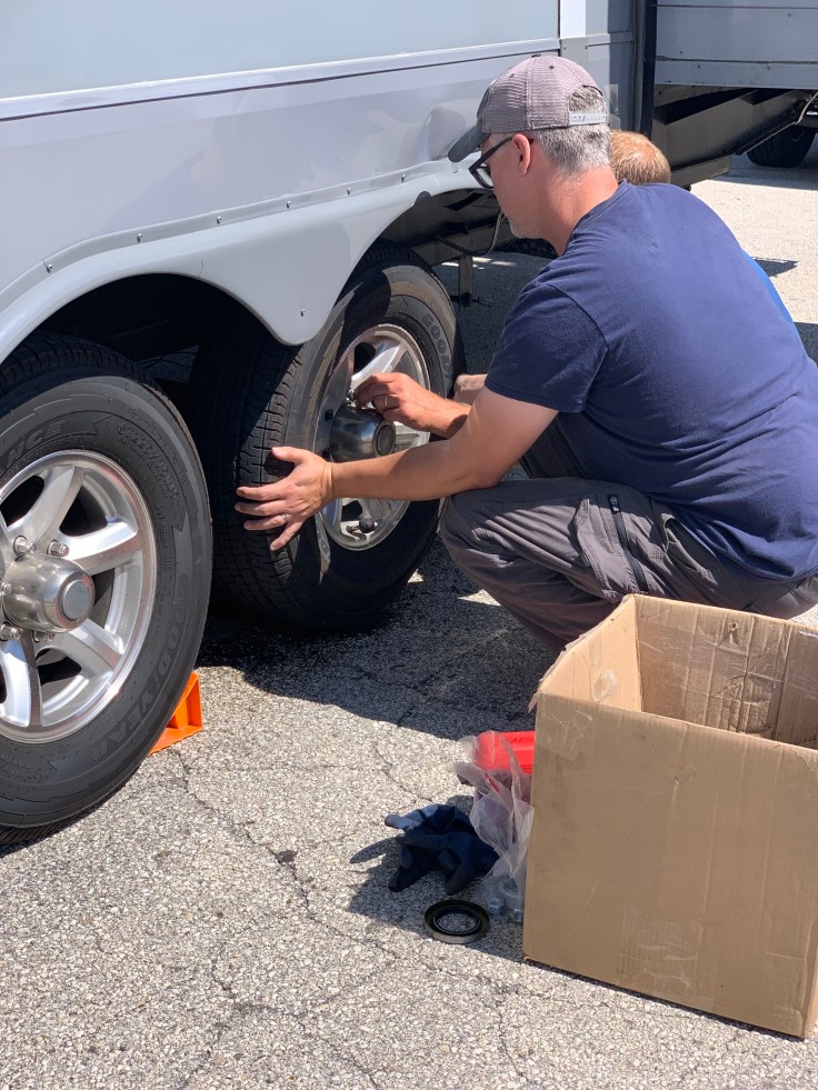 We were rolling right along about two hours into our trip, and another driver alerted us to check our back tire. So we immediately pulled over; the exit was right there and as we turned into a service station our tire rolled right out into the grass! Oh how dangerous that could have been at full speed on the highway!