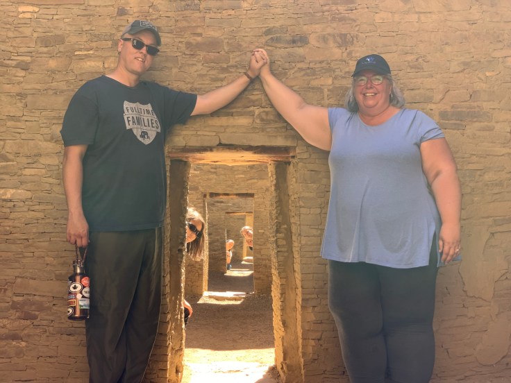 September: Family time, cousins, friends, Jim and Lori, Daisy flies home, Wichita with Roths family, Oklahoma, Santa Fe, NM, Meow Wolf!, Los Alamos, Nuclear museum, elevation 7,320′, Grants, NM, Chaco Culture Canyon National Historical Park, The Rock that Speaks, The Center of the Center, tent camping next to hieroglyphics and under the darkest night sky in the world at the World Heritage site, Chaco. Tour of Kivas, sunrise at sacred kiva with rainbow, National Park Monopoly, Albuquerque, NM.