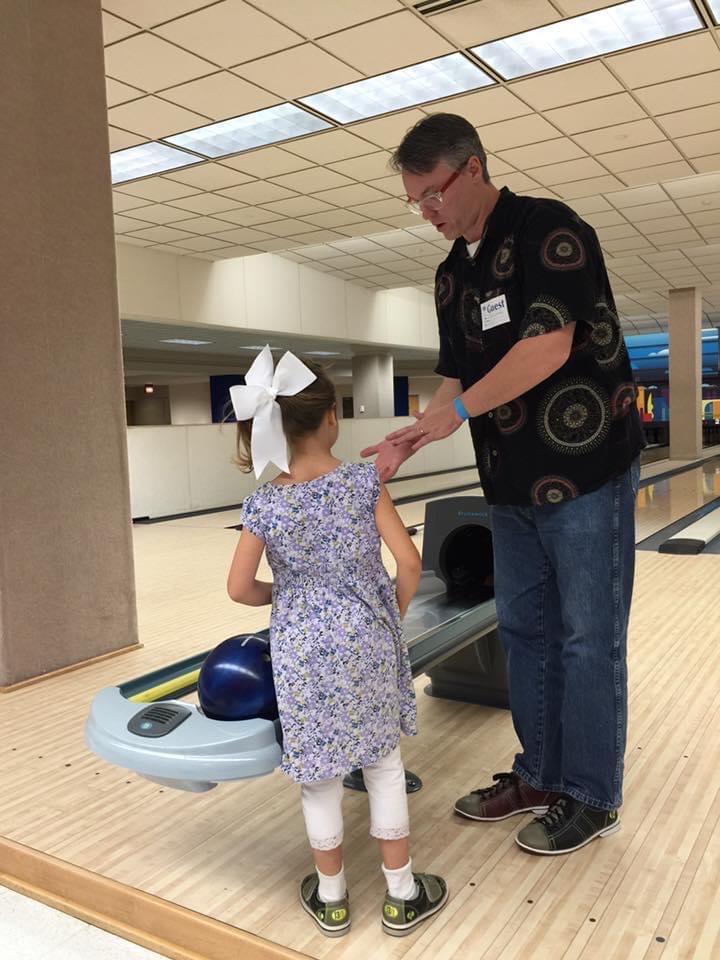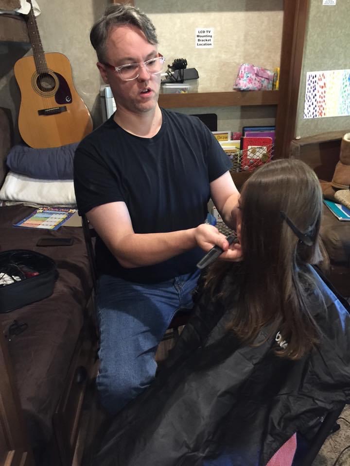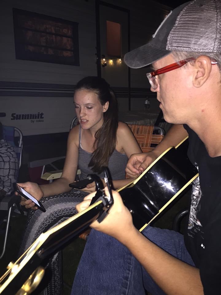 He is teaching them how to change guitar strings; Ruby is wearing ‘safety goggles’.